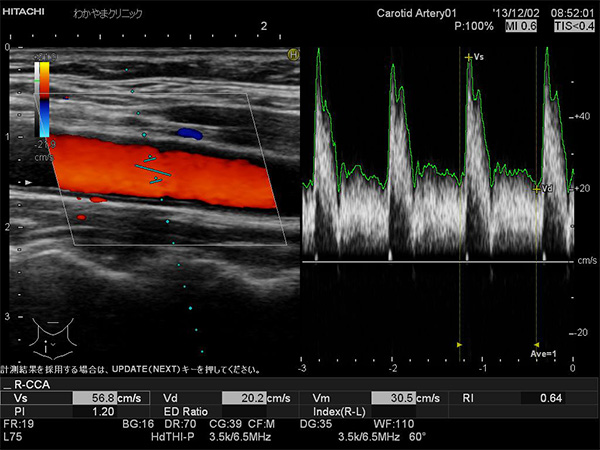 動脈硬化を起こすと血管壁が厚くなったり硬くなったりします。その様子を画像で簡単に確認できます。