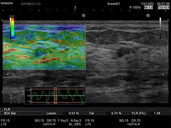 乳がん検査の一つである超音波検査にエラストグラフィを組み合わせることで、硬さという診断に有用な情報を付加し、検査を受ける方にとっても負担の少ない優しい検査がおこなえます。